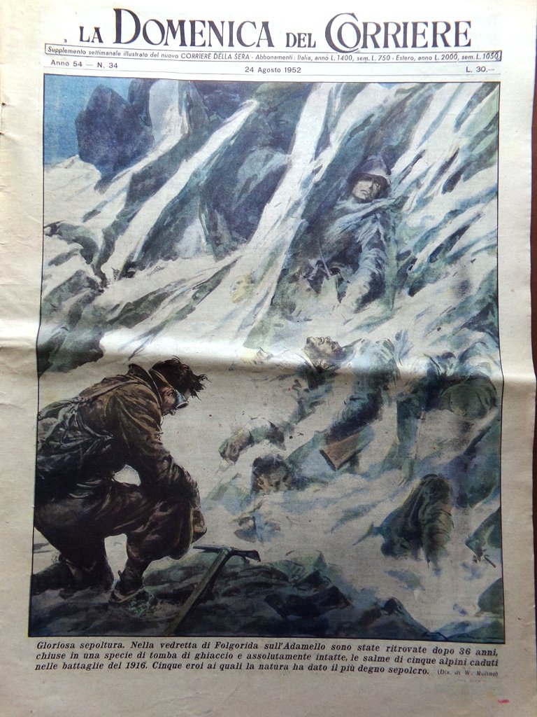Nella vedretta di Folgorida sull'Adamello sono state ritrovate dopo 36 anni, chiuse in una specie di tomba di ghiaccio e assolutamente intatte, le salme di cinque alpini caduti nelle battaglie del 1916. Cinque eroi ai quali la natura ha dato il più degno sepolcro (Walter Molino)