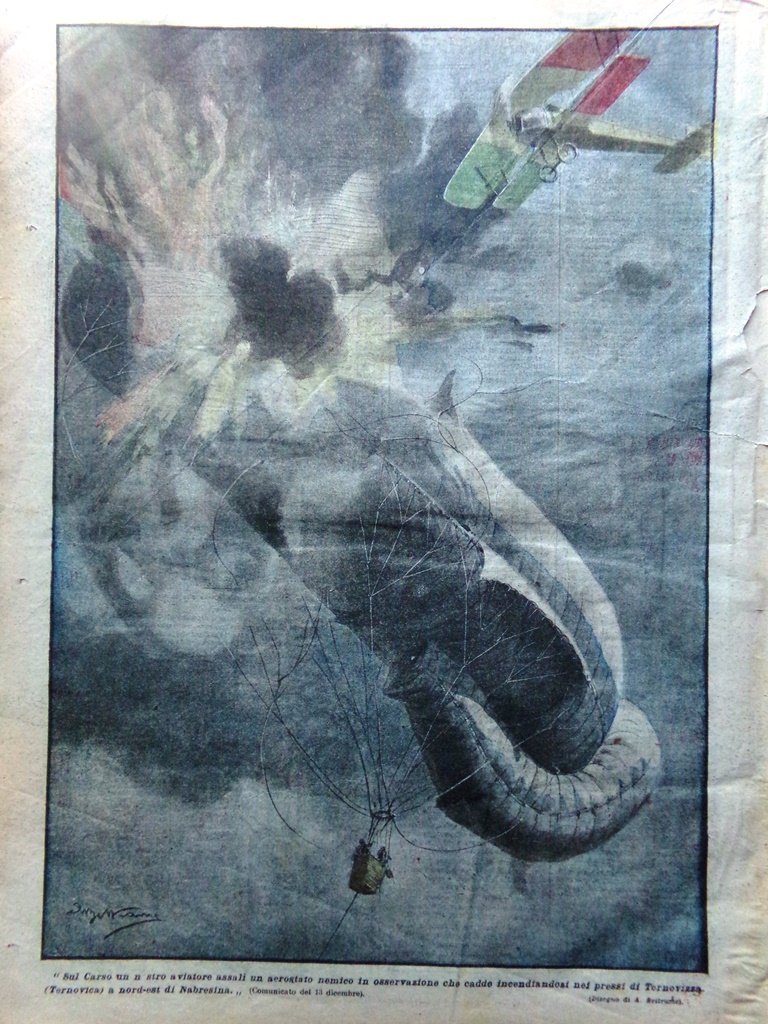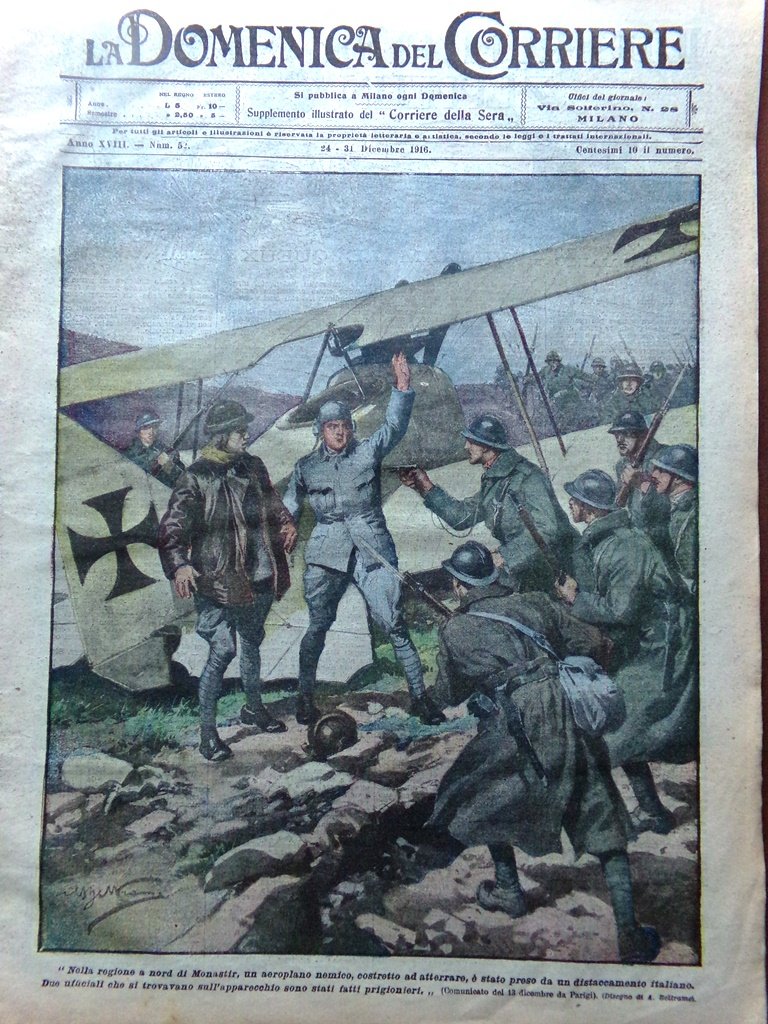 LA DOMENICA DEL CORRIERE Rivista Originale del 24 Dicembre 1916 Anno 18 nr. 52 pagine: 16 dimensioni: 38 x 28 cm IN PRIMA PAGINA: "Nella regione a nord di Monastir, un aeroplano nemico, costretto ad atterrare, è stato preso da un distaccamento italiano e i due ufficiali fatti prigionieri" (Achille Beltrame) NELL'ULTIMA PAGINA: Sul Carso un nostro aviatore assalì un aerostato in osservazione che cadde incendiandosi nei presso di Ternovizza (Achille Beltrame) ALL'INTERNO: L'attività delle donne italiane all'estero Radamisto il bersagliere di 71 anni Decorati al valore La nostra guerra fuori dalla penisola Il generale Nivelle successore di Joffre Nelle trincee del nemico L'istituto centrale di biologia marina a Messina Sui luoghi della guerra nostra CONDIZIONI DELLA RIVISTA: BUONE, NORMALI SEGNI DEL TEMPO, SOVRACOPERTINE MANCANTI NOTE PARTICOLARI: LEGGERE MACCHIE DEL TEMPO E PICCOLISSIMI STRAPPETTI NEI BORDI IN ALCUNE PAGINE
