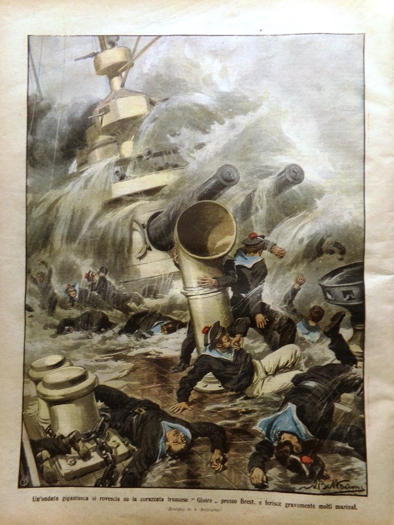 Un'ondata gigantesca si rovescia sulla corazzata francese "Gloire" presso Brest, e ferisce gravemente molti marinai (Achille Beltrame)