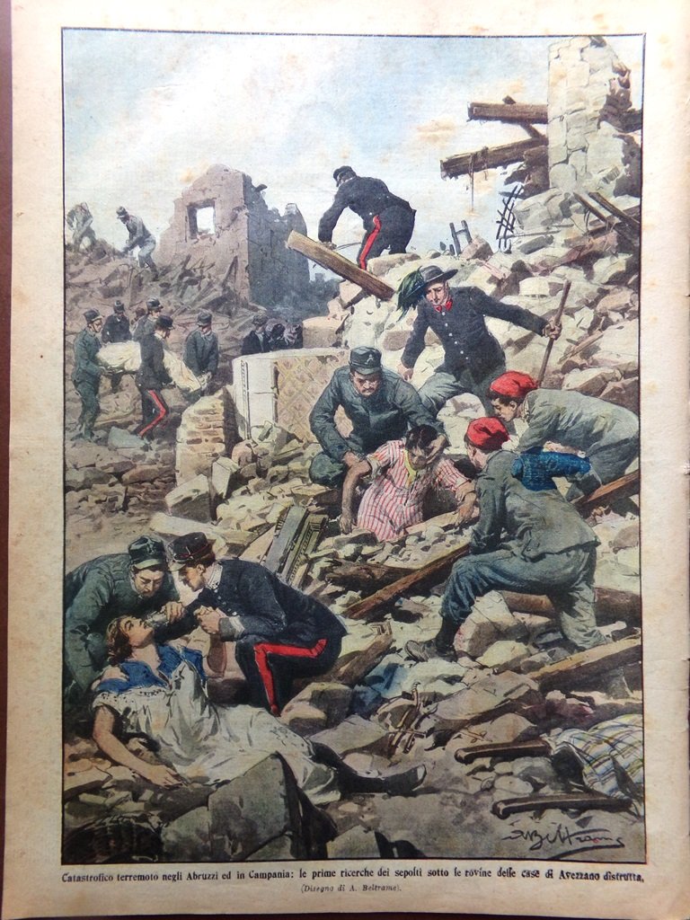 Catastrofico terremoto negli Abruzzi e in Campania: le prime ricerche dei sepolti sotto le rovine delle case di Avezzano distrutta (Achille Beltrame)