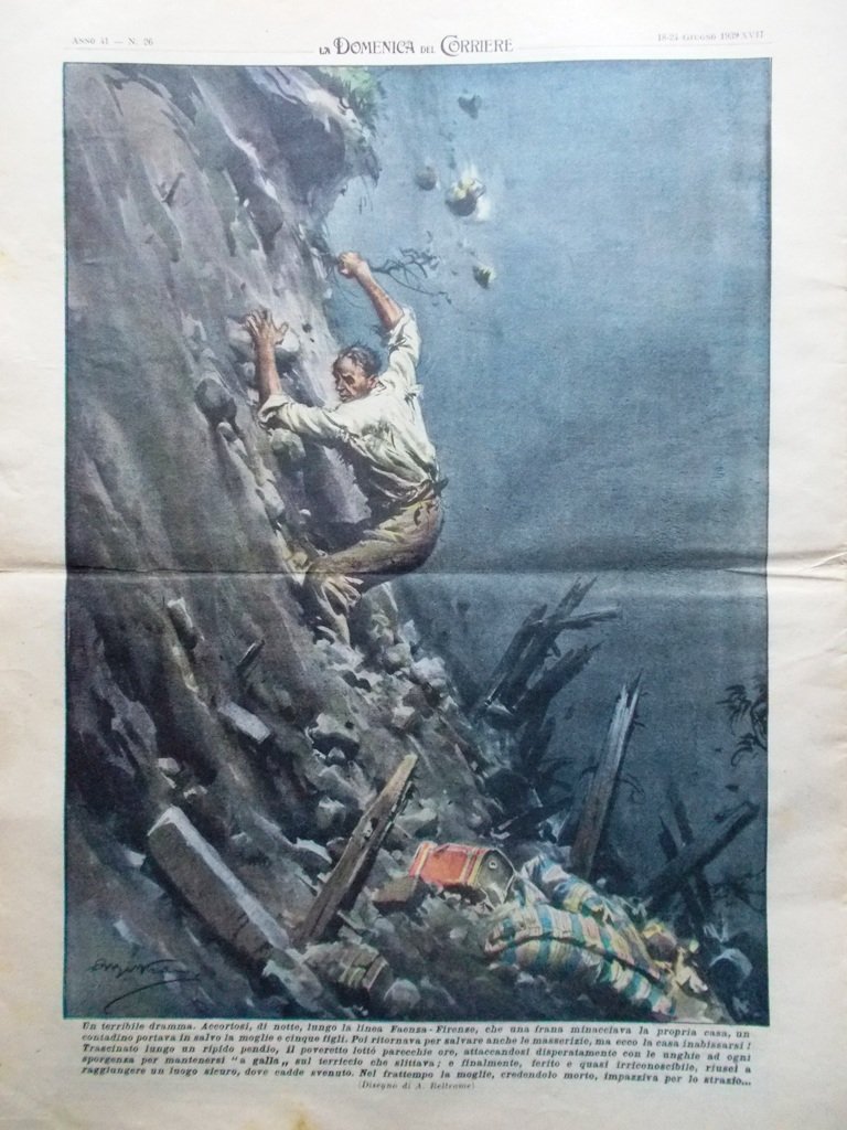 Accortosi, di notte, lungo la linea Faenza-Firenze che una frana minacciava la propria casa, un contadino portava in salvo la moglie e 5 figli. Poi ritornava per salvare anche le masserizie ma ecco la casa inabissarsi! Trascinato lungo un ripido pendio, lottò diverse ore per salvarsi e finalmente ferito e quasi irriconoscibile raggiunse un luogo sicuro ma la moglie, credendolo morto, impazziva per lo strazio (Achille Beltrame)