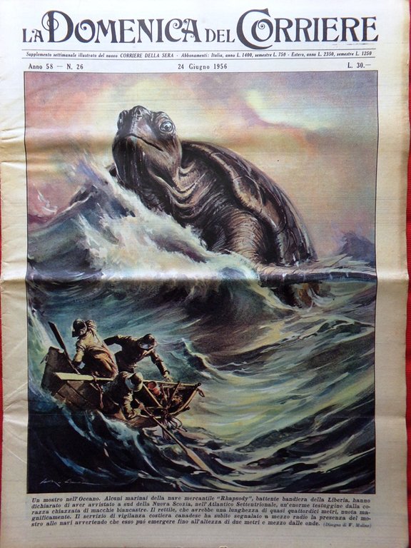 Alcuni marinai della nave mercantile "Rhapsody" battente bandiera della Liberia hanno dichiarato di aver avvistato a sud della Nuova Scozia, nell'Atlantico Settentrionale, un'enorme testuggine dalla corazza chiazzata di macchie biancastre. Il rettile, che avrebbe una lunghezza di quasi quattordici metri, nuota magnificamente. Il servizio di vigilanza costiera canadese ha subito segnalato a mezzo radio la presenza del mostro alle navi avvertendo che esso può emergere fino all'altezza di due metri e mezzo dalle onde (disegno di Walter Molino)