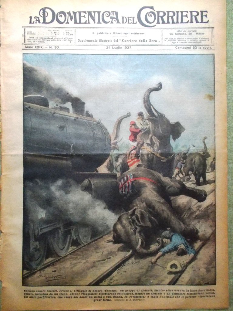 LA DOMENICA DEL CORRIERE Rivista Originale del 24 Luglio 1927 Anno 29 nr. 30 pagine: 16 dimensioni: 38 x 28 cm IN PRIMA PAGINA: Presso il villaggio di Amora (Chicago) un gruppo di elefanti veniva investito da un treno. Alcuni viaggiatori riportarono contusioni mentre un elefante e un domatore rimanevano uccisi. (Achille Beltrame) NELL'ULTIMA PAGINA: L'avventura del cacciatorpediniere americano "Lampson". La nave procedeva a forte velocità quando una grossa balena le si lanciò contro. Allo scossone, parecchi marinai caddero mentre il cetaceo si inabissava (Achille Beltrame) ALL'INTERNO: Le evasioni celebri prima di Léon Daudet Torino: alla ricerca del piede di Cenerentola Isaac Newton, legislatore dell'universo. Gli ospiti dello Yemen all'arena di Milano. De Pinedo cittadino onorario di Milano. Ernesto Panza campione del mondo di tiro con arma da guerra Motociclismo: il circuito di Crema per la categoria 500. Berggieshuebel in Sassonia trasmormata nella valle della morte. A caccia di belve con la macchina fotografica CONDIZIONI DELLA RIVISTA: BUONE, NORMALI SEGNI DEL TEMPO, SOVRACOPERTINE MANCANTI NOTE PARTICOLARI: COPERTINE PARZIALMENTE STACCATE
