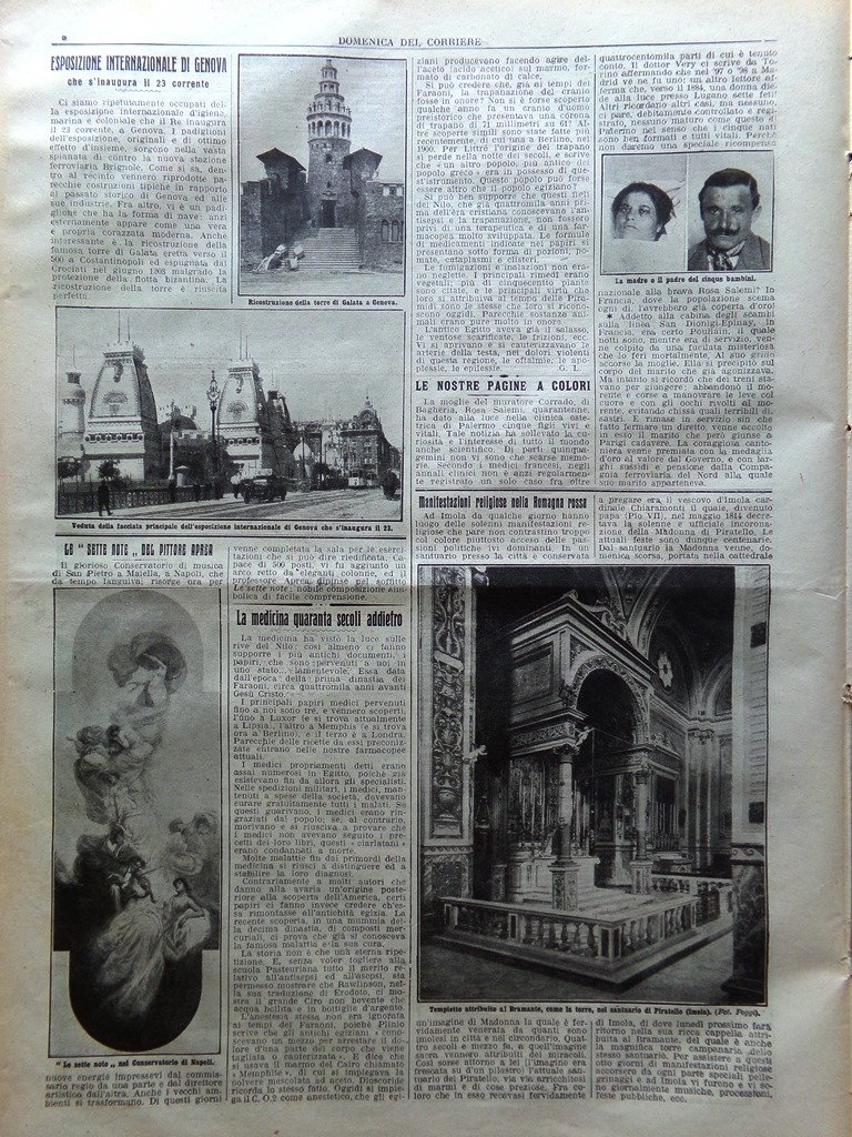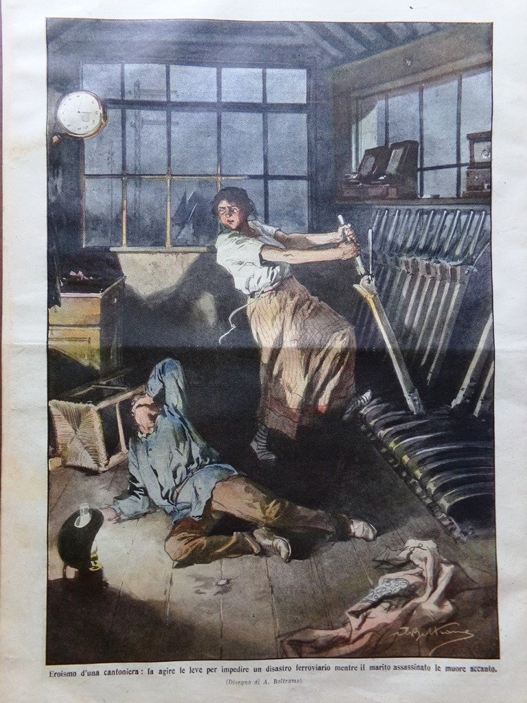 LA DOMENICA DEL CORRIERE Rivista Originale del 24 Maggio 1914 Anno 16 nr. 21 pagine: 16 dimensioni: 38 x 28 cm IN PRIMA PAGINA: Un caso forse unico al mondo: donna siciliana che nell'ospedale di Palermo da alla luce cinque bambini vivi e vitali (Achille Beltrame) NELL'ULTIMA PAGINA: Eroismo di una cantoniera: fa agire le leve per impedire un disastro ferroviario mentre il marito assassinato le muore accanto (Achille Beltrame) ALL'INTERNO: Impressioni del parziale ma violento terremoto presso Catania Manifestazioni religiose nella Romagna rossa L'esposizione internazionale di Genova L'emigrazione negli Stati uniti Cerimonie e credenze popolari a Molfetta Luoghi, costumi e persone in Libia CONDIZIONI DELLA RIVISTA: BUONE, NORMALI SEGNI DEL TEMPO, SOVRACOPERTINE MANCANTI NOTE PARTICOLARI: PICCOLISSIMI STRAPPETTI NEI BORDI IN ALCUNE PAGINE