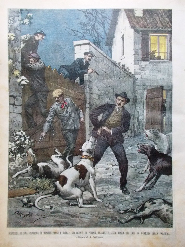 Scoperta di una fabbrica di monete false a Roma: gli agenti di polizia, travestiti, alle prese coi cani di guardia della fabbrica (Achille Beltrame)