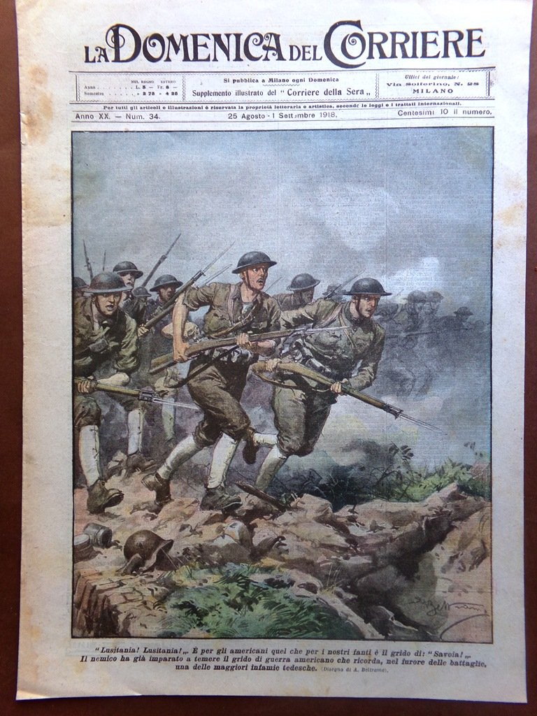 "Lusitania! Lusitania!". per gli americani quel che per i nostri fanti il grido di "Savoia!". Il nemico ha già imparato a temere il grido di guerra americano che ricorda, nel furore delle battaglie, una delle maggiori infamie tedesche (Achille Beltrame)