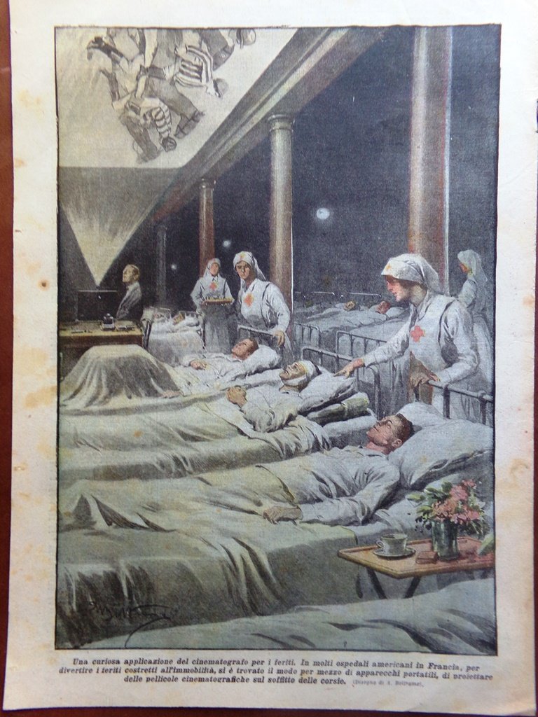 Una curiosa applicazione del cinematografo per i feriti. In molti ospedali americani in Francia, per divertire i feriti costretti all'immobilità , si è trovato il modo per mezzo di apparecchi portatili, di proiettare delle pellicole cinematografiche sul soffitto delle corsie (Achille Beltrame)