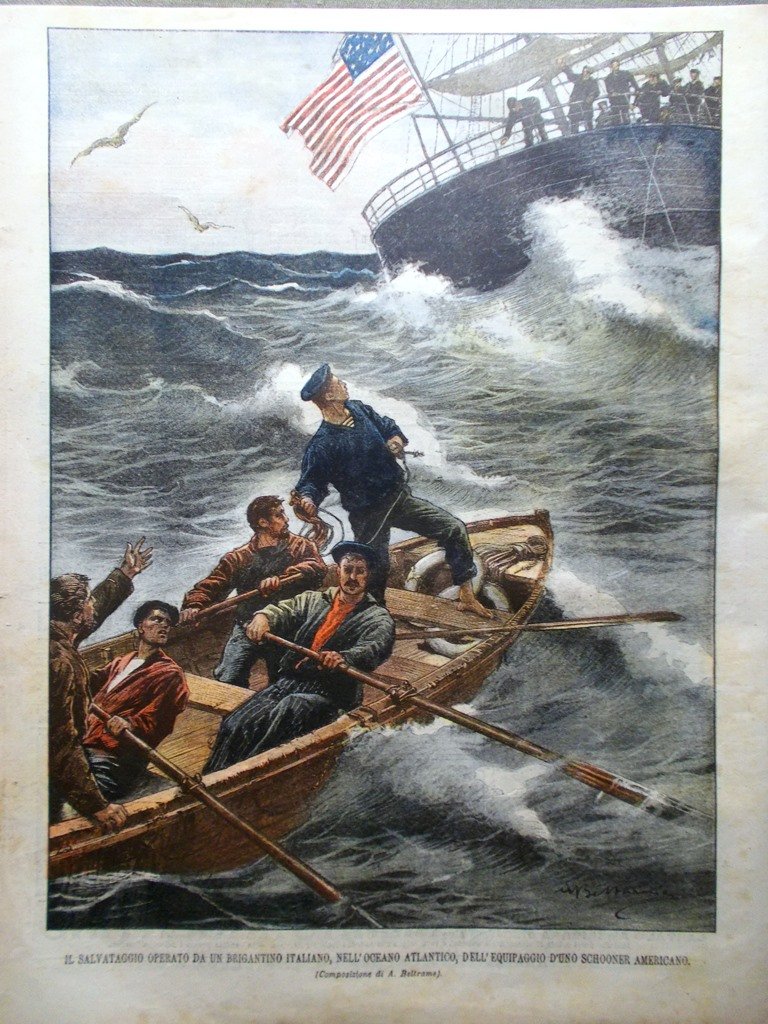 Il salvataggio operato da un brigantino italiano, nell'Oceano Atlantico, dell'equipaggio di uno Schooner americano (Achille Beltrame)