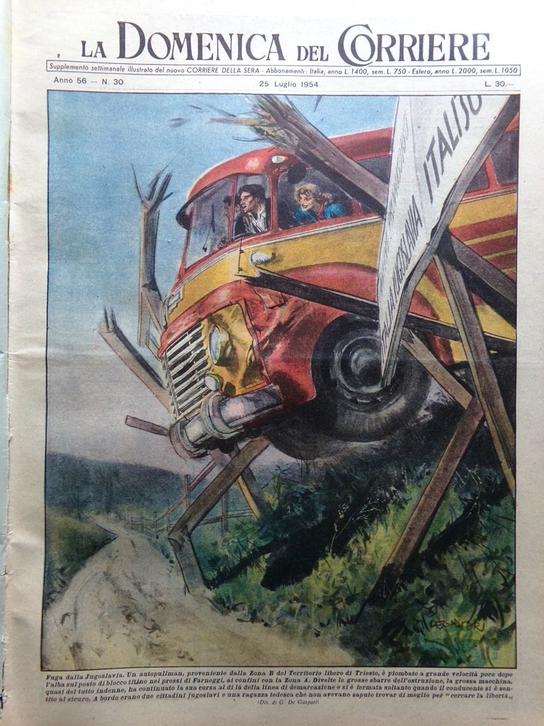 Fuga dalla Jugoslavia. Un autopullman, proveniente dalla Zona B del Territorio libero di Trieste, è piombato a grande velocità poco dopo l'alba sul posto di blocco titini dei pressi di Farneggi, ai confini con la Zona A. Divelte le grosse sbarre dell'ostruzione, la grossa macchina, quasi del tutto indenne, ha continuato la sua corsa al di là della linea di demarcazione e si è fermata quando il conducente si è sentito al sicuro. (De Gaspari)