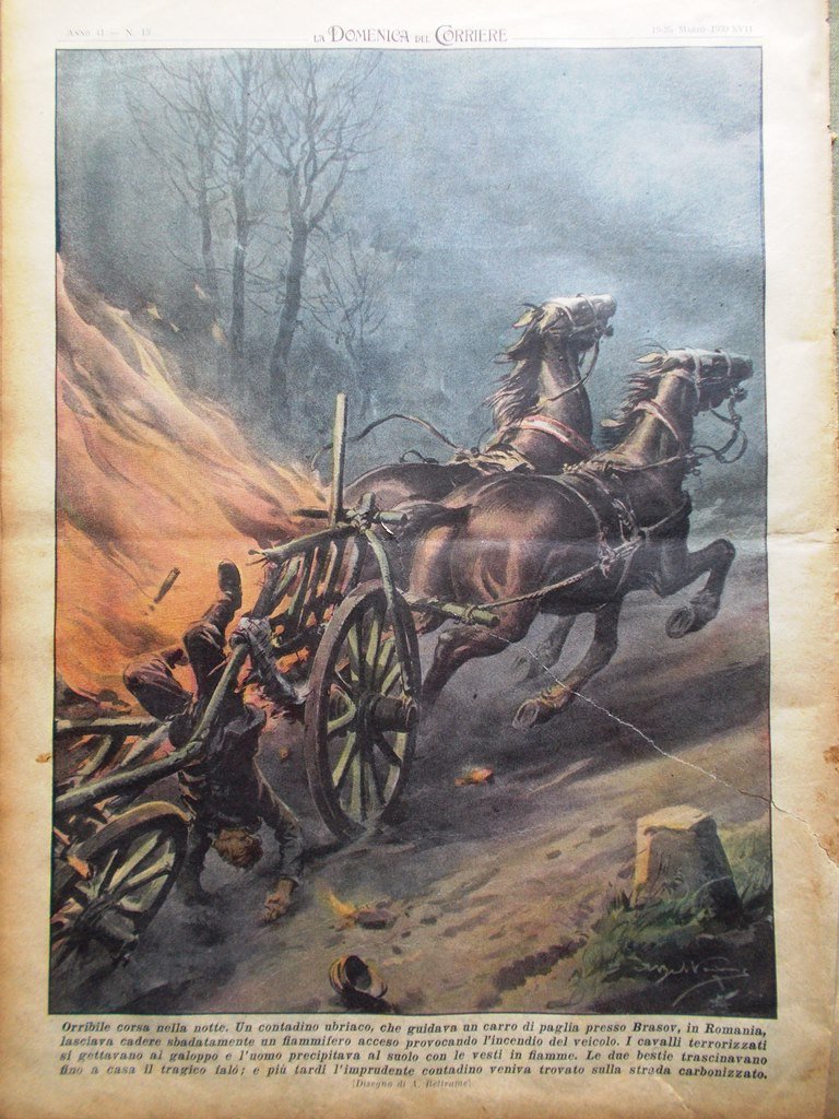 Un contadino ubriaco, che guidava un carro di paglia presso Brasov, in Romania, lasciava cadere sbadatamente un fiammifero acceso provocando l'incendio del veicolo. I cavalli terrorizzati si gettavano al galoppo e l'uomo precipitava al suolo con le vesti in fiamme. Le due bestie trascinavano fino a casa il tragico farò e più tardi il contadino veniva trovato sulla strada, carbonizzato (Achille Beltrame)