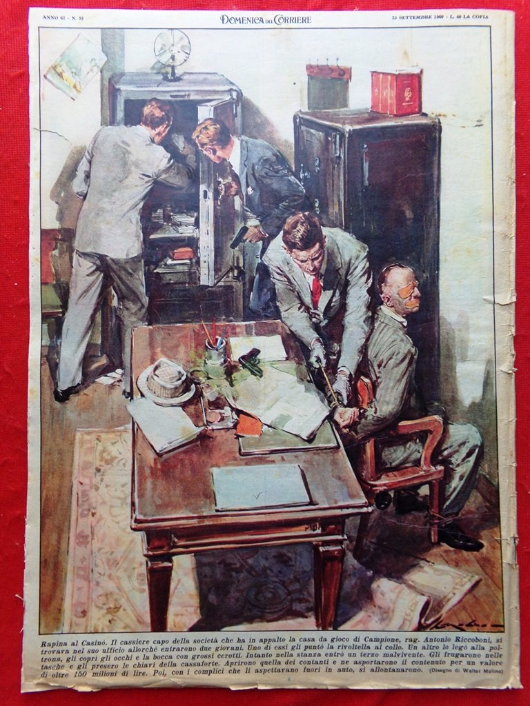 Il cassiere capo della società che ha in appalto la casa da gioco di Campione, rag. Antonio Riccoboni, si trovava nel suo ufficio quando entrarono due giovani che lo immobilizzarono e presero le chiavi della cassaforte. Fuggirono con un bottino di oltre 150 milioni di lire (Walter Molino)