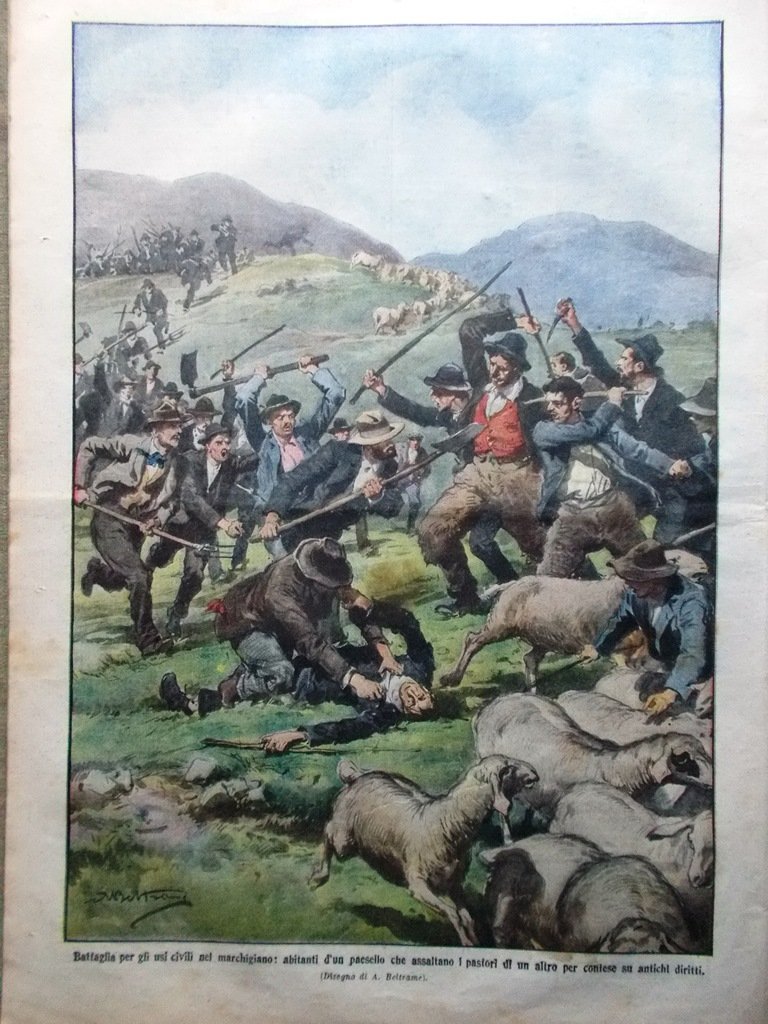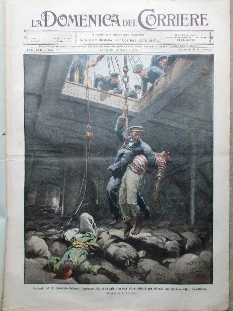 LA DOMENICA DEL CORRIERE Rivista del 26 Aprile 1914 Anno 16 nr. 17 pagine: 16 dimensioni: 38 x 28 cm IN PRIMA PAGINA: Eroismo in un piroscafo italiano: capitano che si fa calare in una stiva infetta per salvare due marinai colpiti da asfissia (Achille Beltrame) NELL'ULTIMA PAGINA: Battaglia per gli usi civili nel marchigiano: abitanti di un paesello che assaltano i pastori di un altro per contese su antichi diritti (Achille Beltrame) ALL'INTERNO: La nuova università egiziana La passione e la morte di Cristo in un comunello nel Biellese (Oberammergau) Rinnovamento della flotta navale russa La distruzione elettrica delle cavallette Il futurismo nella danza Il palazzo delle poste e telegrafi a Firenze La caccia al Radio CONDIZIONI DELLA RIVISTA: BUONE, NORMALI SEGNI DEL TEMPO. SOVRACOPERTINE PRESENTI NOTE PARTICOLARI: LIEVI MACCHIE A PAG 15