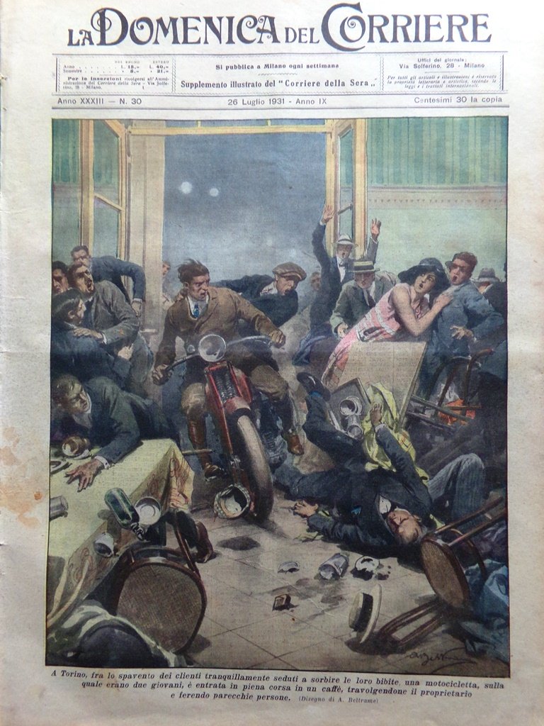 A Torino, fra lo spavento dei clienti tranquillamente seduti a sorbire le loro bibite, una motocicletta, sulla quale erano due giovani, è entrata in piena corsa in un caffè , travolgendone il proprietario e ferendo parecchie persone (Achille Beltrame)