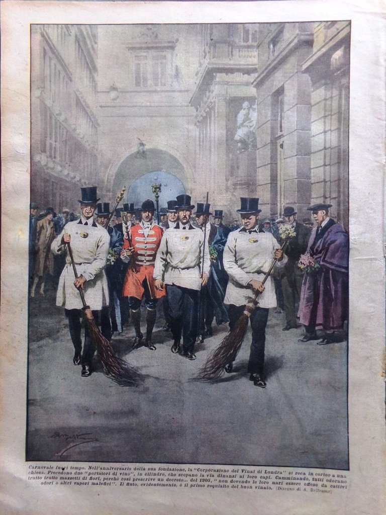 Nell'anniversario della sua fondazione, la "Corporazione dei Vinai di Londra" si reca in corteo a una chiesa. Precedono due "portatori di vino" in cilindro, che scopano la via dinanzi ai loro capi. Camminando, tutti odorano tratto tratto mazzetti di fiori, perché così prescrive un decreto.del 1205 (Achille Beltrame)