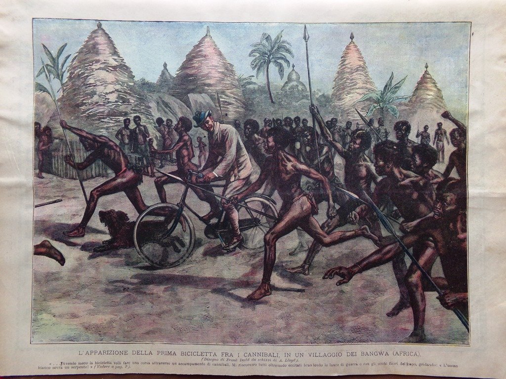 L'apparizione della prima bicicletta fra i cannibali in un villaggio del Bangwa (Africa) (Frank Dadd)