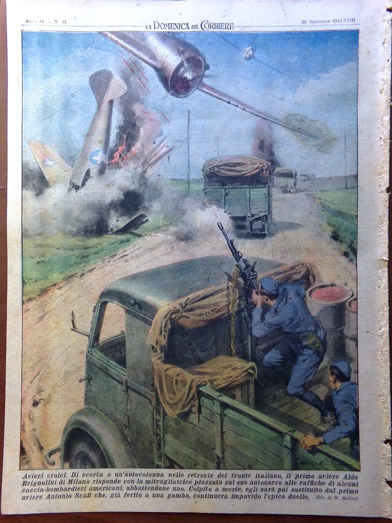 Di scorta a un'autocolonna nelle retrovie del fronte italiano, il primo aviere Aldo Brignolini di Milano risponde con una mitragliatrice piazzata sul suo autocarro alle raffiche di alcuni caccia-bombardieri americani, abbattendone uno. Colpito a morte egli sarà poi sostituito dal primo aviere Antonio Scafi che, già ferito a una gamba, continuerà l'impavido duello (Walter Molino)