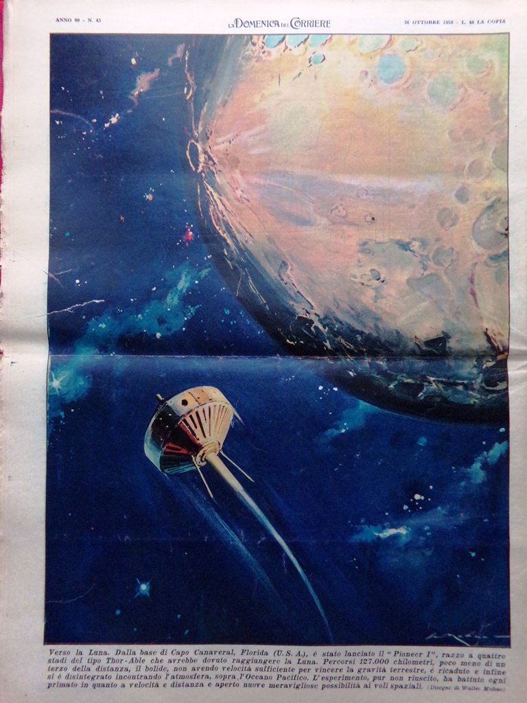 Dalla base di Cape Canaveral, Florida (U.S.A.) è stato lanciato il "Pioneer I", razzo che avrebbe dovuto raggiungere la Luna. Percorsi 127.000 chilometri, poco meno di un terzo della distanza, il bolide, non avendo velocità sufficiente per vincere la gravità terrestre, è ricaduto disintegrandosi incontrando l'atmosfera sopra l'Oceano Pacifico (Walter Molino)