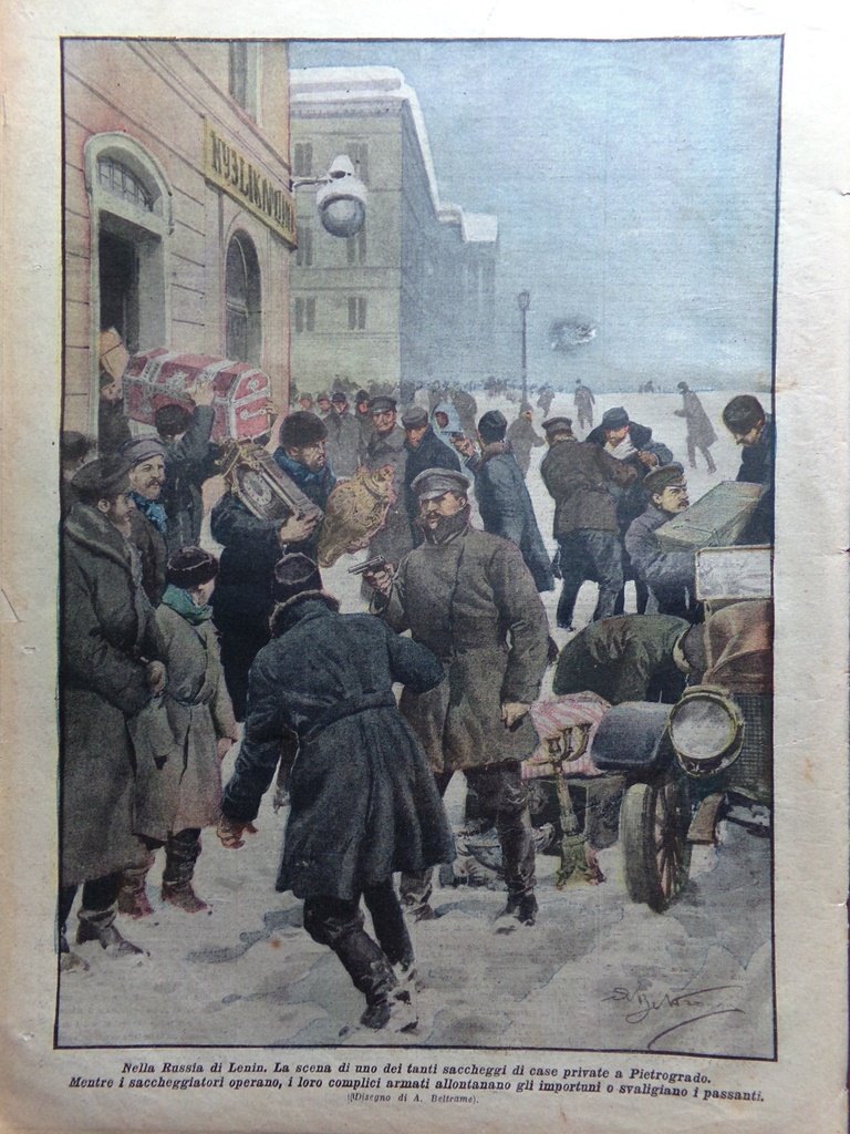 Nella Russia di Lenin. La scena di uno dei tanti saccheggi di case private a Pietroburgo. Mentre i saccheggiatori operano i loro complici armati allontanano gli importuni o svaligiano i passanti (Achille Beltrame)
