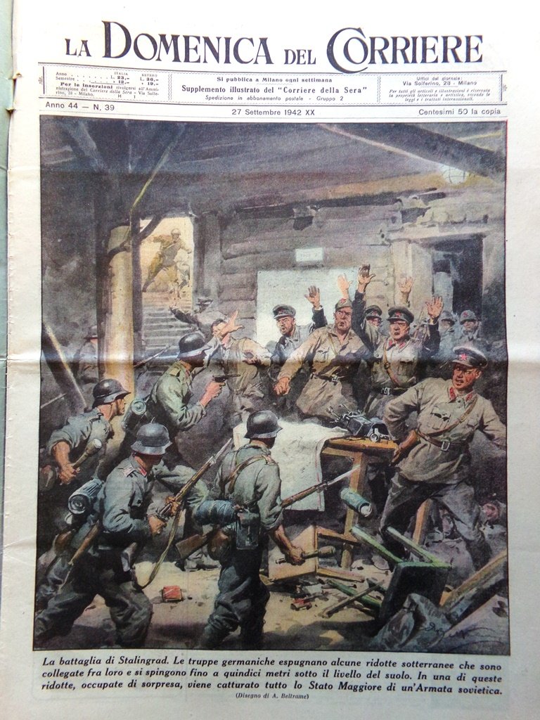La battaglia di Stalingrad. Le truppe germaniche espugnano alcune ridotte sotterranee che sono collegate fra loro e si spingono fino a quindici metri sotto il livello del suolo. In una di queste ridotte, occupate e di sorpresa, viene catturato tutto lo stato maggiore di un'armata sovietica (Achille Beltrame)