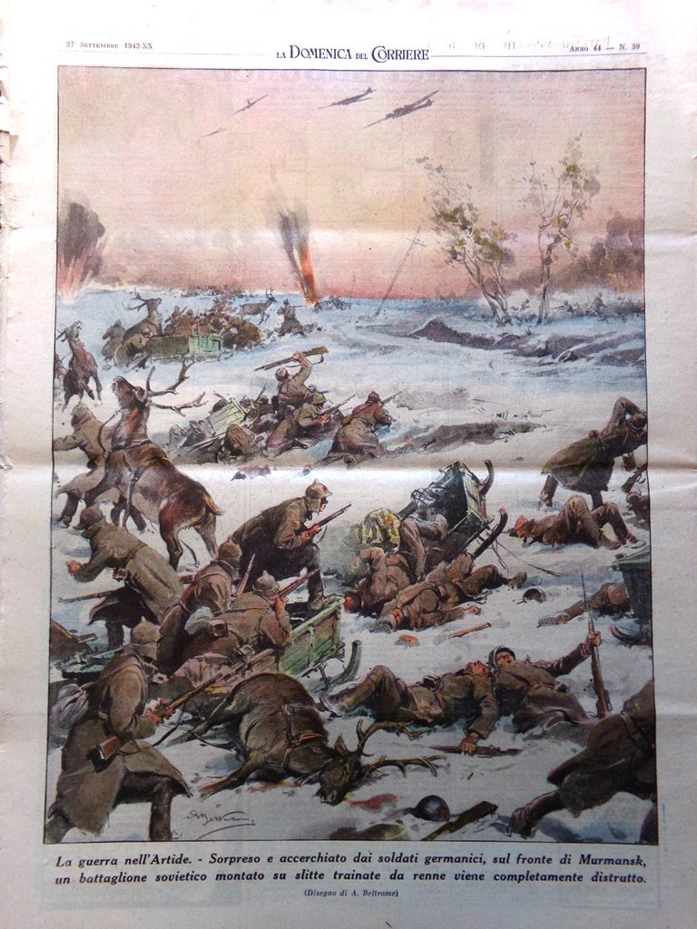 La guerra nell'Artide. Sorpreso e accerchiato dai soldati germanici, sul fronte di Murmansk, un battaglione sovietico montato su slitte trainate da renne viene completamente distrutto (Achille Beltrame)