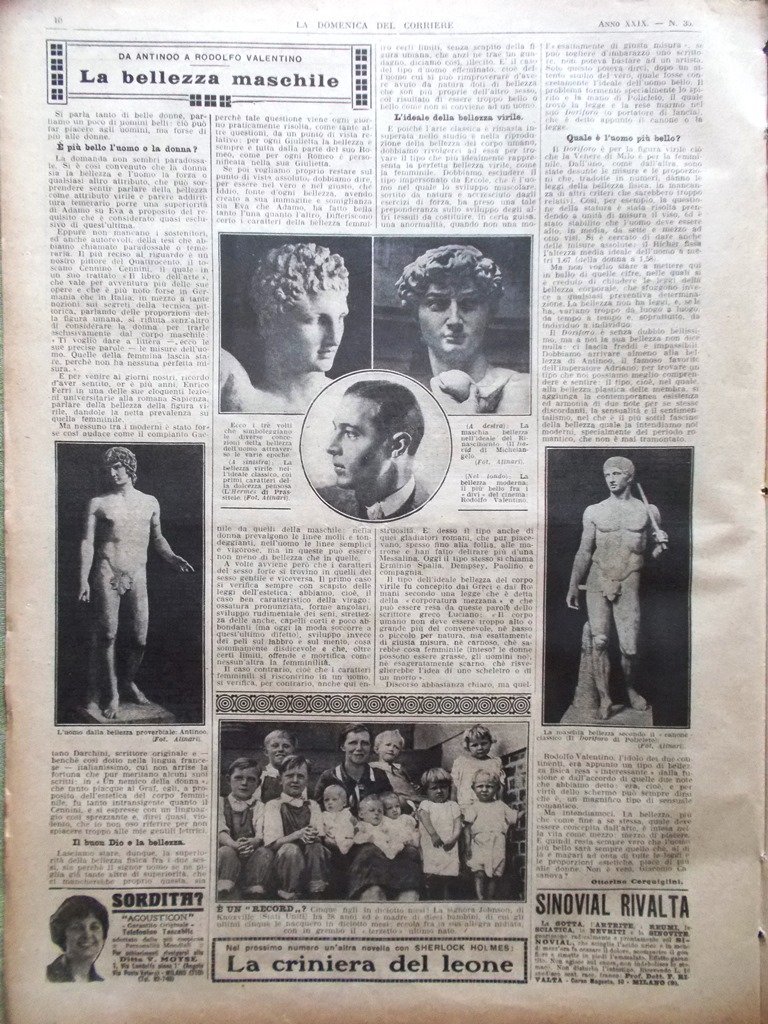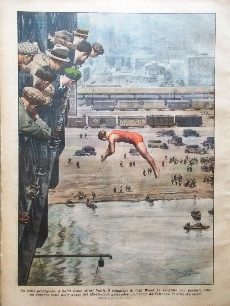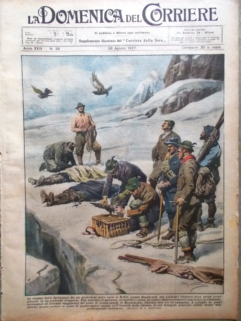 LA DOMENICA DEL CORRIERE Rivista Originale del 28 Agosto 1927 Anno 29 nr. 35 pagine: 16 dimensioni: 38 x 28 cm IN PRIMA PAGINA: Le vittime della montagna. Su un ghiacciaio della valle di Ziller, presso Innsbruck, due alpinisti viennesi sono periti precipitando in un profondo crepaccio. Una squadra di soccorso, recuperati i corpi ha potutto immediatamente segnalare la disgrazia servendosi di colombi viaggiatori del posto di gendarmeria di Mayerhofen (Achille Beltrame) NELL'ULTIMA PAGINA: Un salto prodigioso. A Saint Louis (Stati Uniti) il campione di tuffi Wood ha eseguito con perfetto stile un pauroso salto nelle acque del Mississippi, gettandosi da un'altezza di oltre 37 metri (Achille Beltrame) ALL'INTERNO: Il principe di Piemonte alla colonia alpina di Gressoney I misteri della costituzione umana: quale malattia ci è destinata ? Il soggiorno di Re Fuad in Italia. Un'isola artificiale nell'Atlantico. Il nuovo ponte di pietra di Salcano. I lavori per il nuovo ponte di Malnate. Il carnevale estivo a Viareggio La bellezza maschile CONDIZIONI DELLA RIVISTA: BUONE, NORMALI SEGNI DEL TEMPO, SOVRACOPERTINE MANCANTI NOTE PARTICOLARI: PICCOLI STRAPPETTI NEI BORDI DI ALCUNE PAGINE