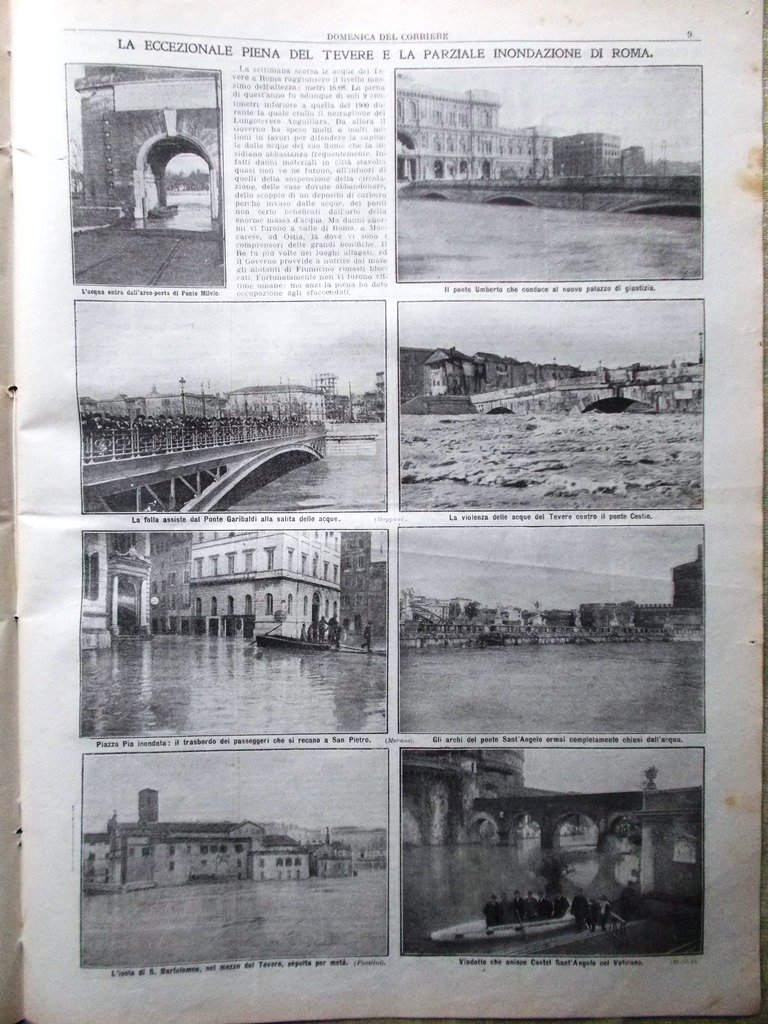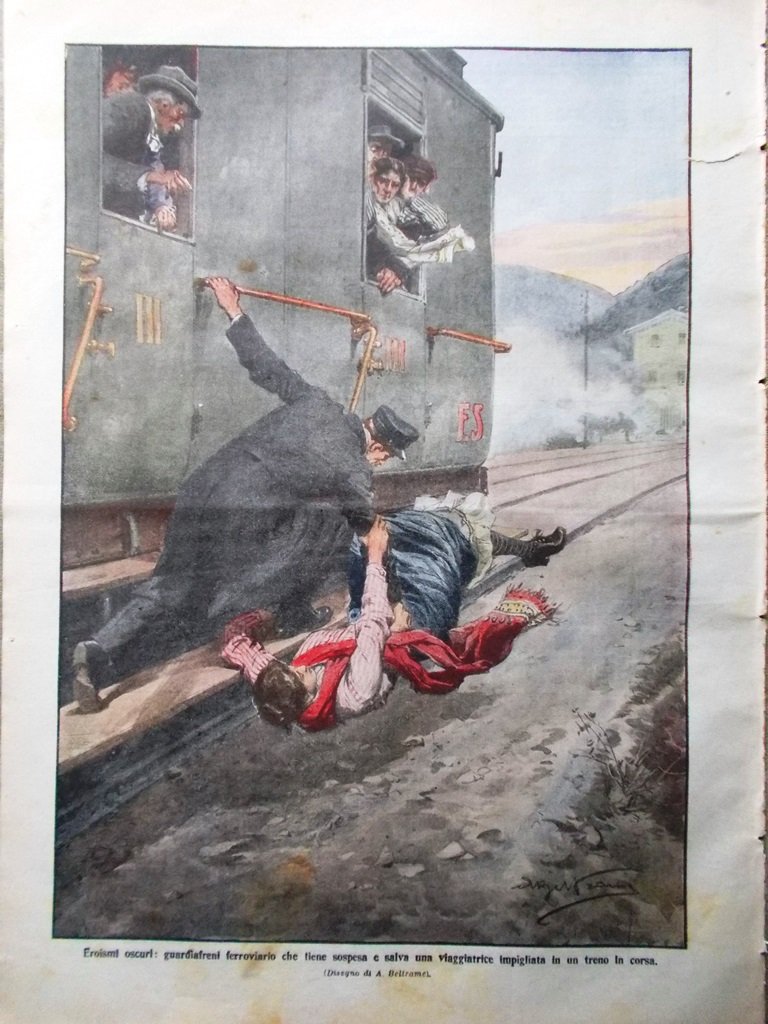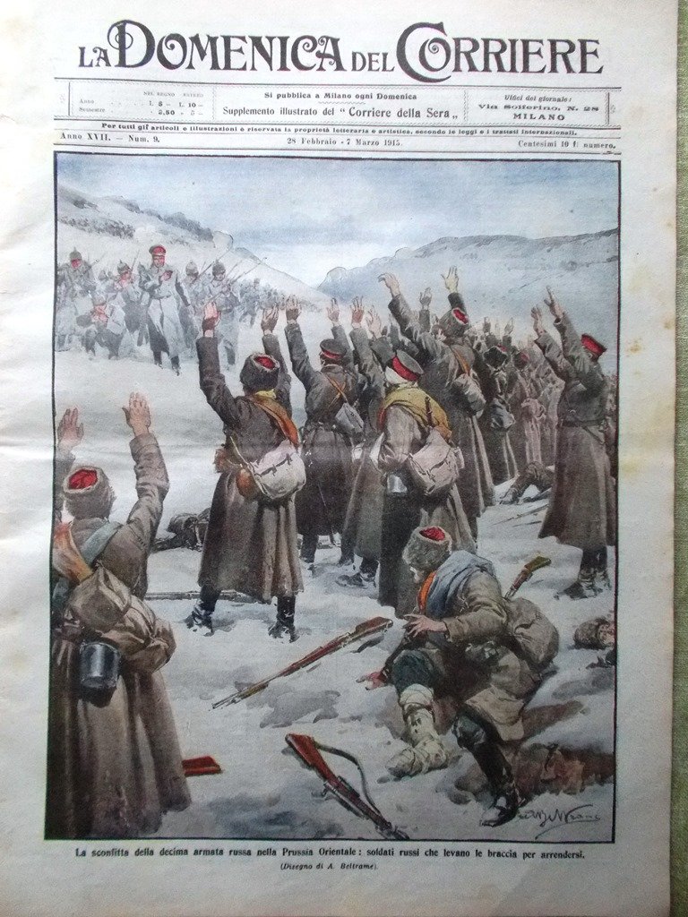 LA DOMENICA DEL CORRIERE Rivista Originale del 28 Febbraio 1915 Anno 17 nr. 9 pagine: 16 dimensioni: 38,5 x 28,5 cm IN PRIMA PAGINA: La sconfitta della decima armata russa nella Prussia Orientale: soldati russi che levano le braccia per arrendersi (Achille Beltrame) NELL'ULTIMA PAGINA: Eroismi oscuri: guardiafreni ferroviario che tiene sospesa e salva una viaggiatrice impigliata in un treno in corsa(Achille Beltrame) ALL'INTERNO: Artisti che si ritirano: Ermete Novelli, Virginia Reiter Inverno gravido di piogge e nevi: Arno a Firenze, Umbria, Riviera I danni della neve in Valsassina La piena del Tevere e la parziale inondazione di Roma Dai luoghi del terremoto: statua di S. Emidio ad Avezzano, neve sulle rovine di Sora Danneggiata l'abbazia di Montecassino Figure del giorno: Ricciotti Garibaldi, Sarah Bernhardt (cui tagliarono una gamba) Lo sbarramento del torrente Beonia CONDIZIONI DELLA RIVISTA: BUONE, NORMALI SEGNI DEL TEMPO. SOVRACOPERTINE ASSENTI NOTE PARTICOLARI: STRAPPETTO NEL BORDO ALTO DI QUASI TUTTO IL GIORNALE (V. FOTO)
