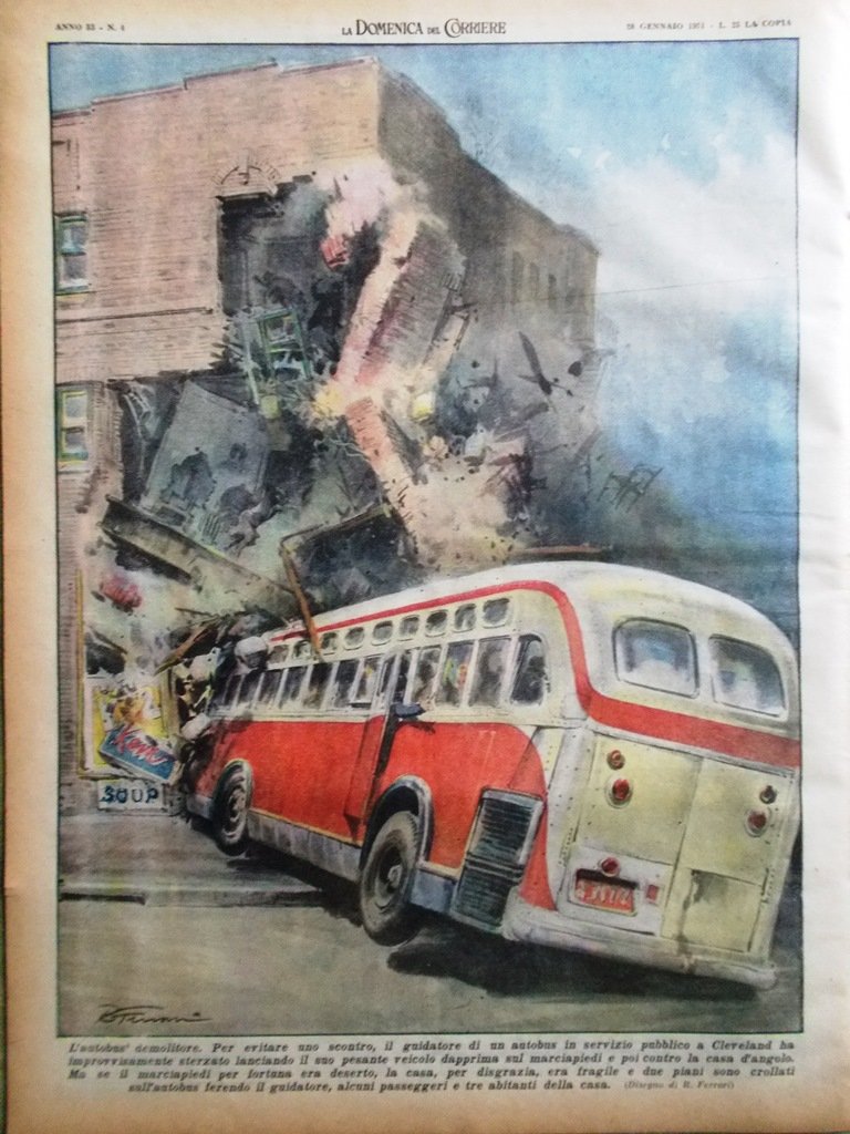 Per evitare uno scontro, il guidatore di un autobus in servizio pubblico a Cleveland ha improvvisamente sterzato lanciando il suo pesante veicolo dapprima sul marciapiedi e poi contro la casa d'angolo. Ma se il marciapiedi per fortuna era deserto, la casa, per disgrazia, era fragile e due piani sono crollati sull'autobus ferendo il guidatore, alcuni passeggeri e tre abitanti della casa (R. Ferrari)
