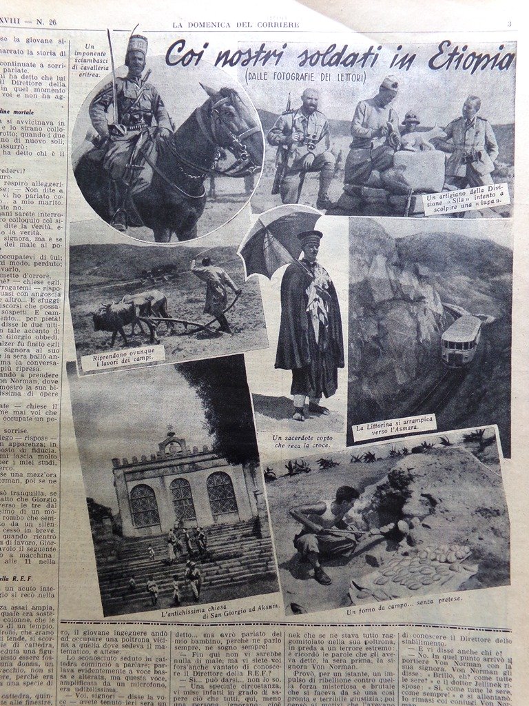 Continuano in Etiopia le sottomissioni di alti personaggi. Ad Addis Abeba il Vicer Graziani ha ricevuto Ras Hapte Micael, capo dello Uollo, il quale ha insistito perch il Vicer accettasse la propria spada, il proprio scudo di famiglia, il manto di ras e il casco di battaglia (Achille Beltrame)