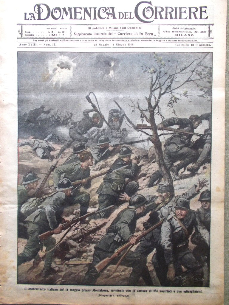 LA DOMENICA DEL CORRIERE Rivista del 28 Maggio 1916 Anno 18 nr. 22 pagine: 16 dimensioni: 38 x 28 cm IN PRIMA PAGINA: Il contrattacco italiano del 14 maggio presso Monfalcone, terminato con la cattura di 254 austriaci e due mitragliatrici (Achille Beltrame) NELL'ULTIMA PAGINA: Nel Trentino mentre si sviluppa l'offensiva austriaca: segnalazioni ottiche da una posizione difesa dagli alpini (Achille Beltrame) ALL'INTERNO: Le scuole per i mutilati in Francia La missione francese sul fronte italiano Decorati al valore Alle vittime del primo giorno di guerra: a Senigallia Sui luoghi dell'offensiva austriaca Dall'Adamello a Monfalcone La partenza degli ospedali chirurgici-mobili per il fronte CONDIZIONI DELLA RIVISTA: BUONE, NORMALI SEGNI DEL TEMPO. SOVRACOPERTINE ASSENTI NOTE PARTICOLARI: MACCHIE DEL TEMPO IN ALCUNE PAGINE