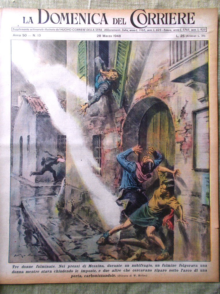 Tre donne fulminate. Nei pressi di Messina, durante un nubifragio, un fulmine folgorava una donna mentre stava chiudendo le imposte, e due altre che cercavano riparo sotto l'arco di una porta, carbonizzandole (Walter Molino)