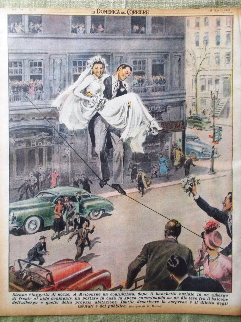 A Melbourne un equilibrista, dopo il banchetto nuziale in un albergo di fronte al nido coniugale, ha portato a casa la sposa camminando su un filo teso fra il balcone dell'albergo e quello della propria abitazione (Walter Molino)