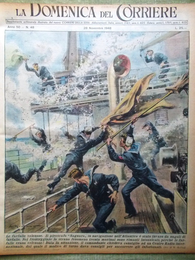Il piroscafo "Sagnaro" in navigazione nell'Atlantico è stato invaso da nugoli di farfalle. Nel fronteggiare lo strano fenomeno trenta marinai sono rimasti intossicati perché le farfalle erano velenose! (Walter Molino)