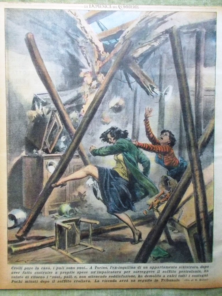 Crolli pure la casa, i pali sono suoi. A Torino l'ex inquilina di un appartamento sinistrato, dopo aver fatto costruire a proprie spese un'impalcatura per sorreggere il soffito pericolante, ha voluto di ritorno i "suoi" pali e non ottenendo soddisfazione, ha demolito a calci tutti i sostegni. Pochi minuti dopo il soffitto crollava (Walter Molino)