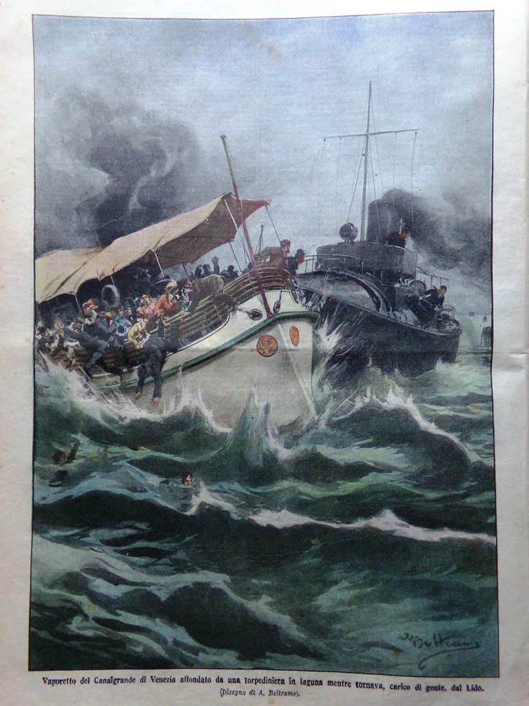 LA DOMENICA DEL CORRIERE Rivista Originale del 29 Marzo 1914 Anno 16 nr. 13 pagine: 16 (+4) dimensioni: 38 x 28 cm IN PRIMA PAGINA: La dolorosa fine di uno scienziato: il direttore dell'Osservatorio vesuviano, prof. Mercalli, bruciato vivo nel suo studio, a Napoli (Achille Beltrame) NELL'ULTIMA PAGINA: Vaporetto del Canalgrande di Venezia affondato da una torpediniera in laguna mentre tornava, carico di gente, dal Lido (Achille Beltrame) ALL'INTERNO: L'assassinio di Gaston Calmette, direttore del Figaro Le grandi case popolari di prossima inaugurazione a Napoli Quanta parte di mondo è ancora sconosciuta La distruzione della città italiana di Jequié Il duomo di Pienza L'on. Antonio Salandra e Alda Rizi In Tripolitania Le mitragliatrici modello in uso nei vari eserciti Nuova bonifica nei terreni delle valli d'Oca e Sagreda CONDIZIONI DELLA RIVISTA: BUONE, NORMALI SEGNI DEL TEMPO, SOVRACOPERTINE PRESENTI NOTE PARTICOLARI: SEGNI DI SCOTCH AL CENTRO TRA PAG 6 e 7 (LETTURA NON COMPROMESSA), LEGGERE MACCHIE DEL TEMPO E PICCOLI STRAPPETTI NEI BORDI IN ALCUNE PAGINE