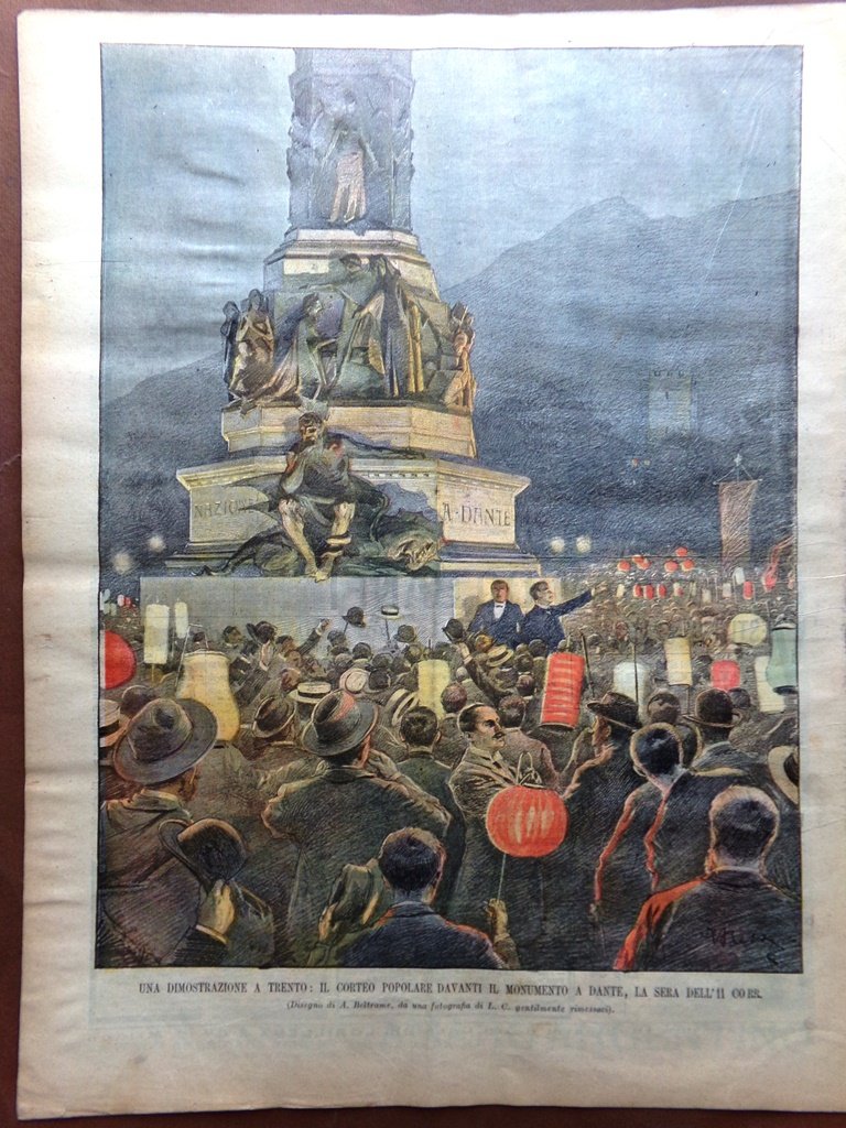 Una dimostrazione a Trento: il corteo popolare davanti il monumento a Dante, la sera dell'11 corr. (Achille Beltrame)