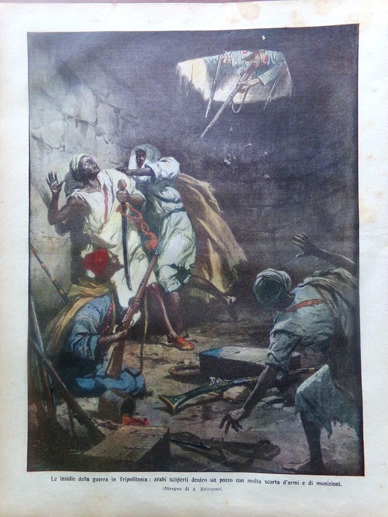 Le insidie della guerra in Tripolitania: arabi scoperti dentro un pozzo con molta scorta d'armi e di munizioni (Achille Beltrame)