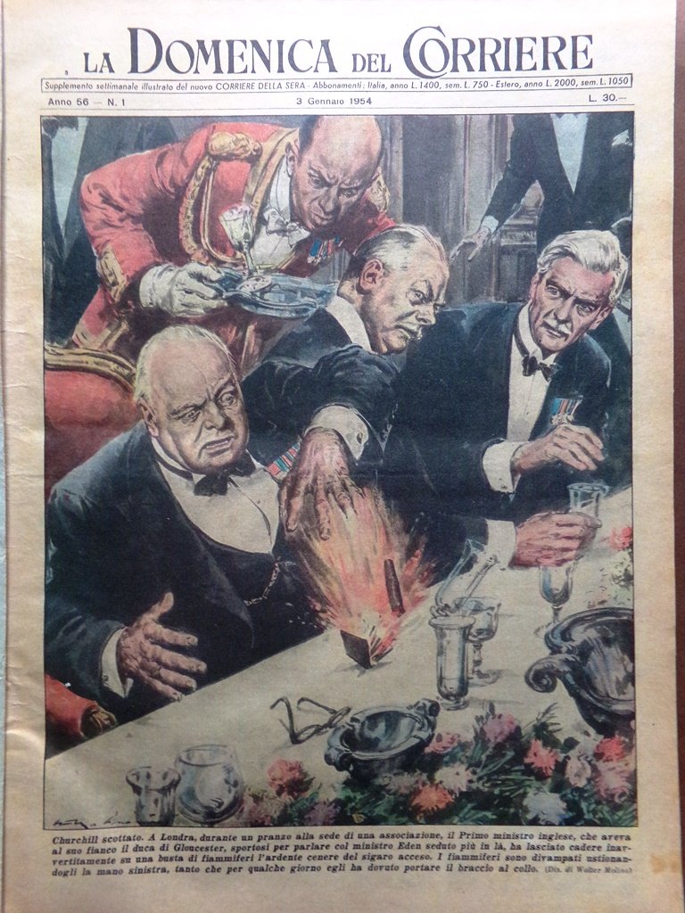 Churchill scottato. A Londra durante un pranzo alla sede di un'associazione, il Primo ministro inglese, che aveva al suo fianco il duca di Gloucester, sportosi per parlare col ministro Eden seduto più in là, ha lasciato cadere inavvertitamente su una busta di fiammiferi l'ardente cenere del sigaro acceso. I fiammiferi sono divampati ustionandogli la mano sinistra, tanto che per qualche giorno egli ha dovuto portare il braccio al collo (Walter Molino)