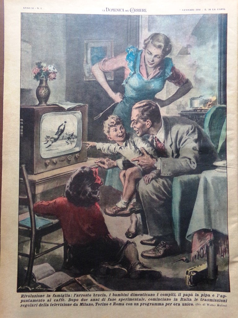 Rivoluzione in famiglia: l'arrosto brucia, i bambini dimenticano i compiti, il papà la pipa e l'appuntamento al faccè. Dopo due anni di fase sperimentale, cominciano in Italia le trasmissioni regolari della televisione da Milano, Torino e Roma con un programma per ora unico (Walter Molino)