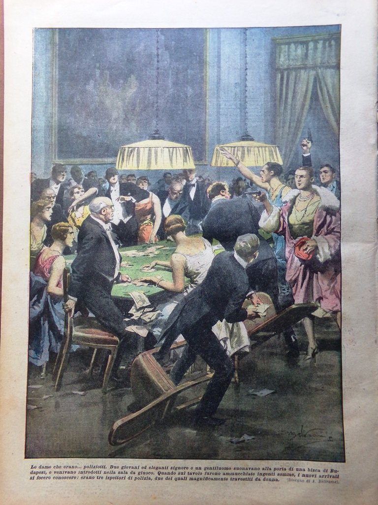 Le dame che erano.poliziotti. Due giovani ed eleganti signore e un gentiluomo suonavano alla porta di una bisca di Budapest e venivano introdotti alla sala da gioco. Quando sul tavolo furono ammucchiate ingenti somme, i nuovi arrivati si fecero conoscere: erano tre ispettori di polizia, due dei quali travestiti da donna (Achille Beltrame)