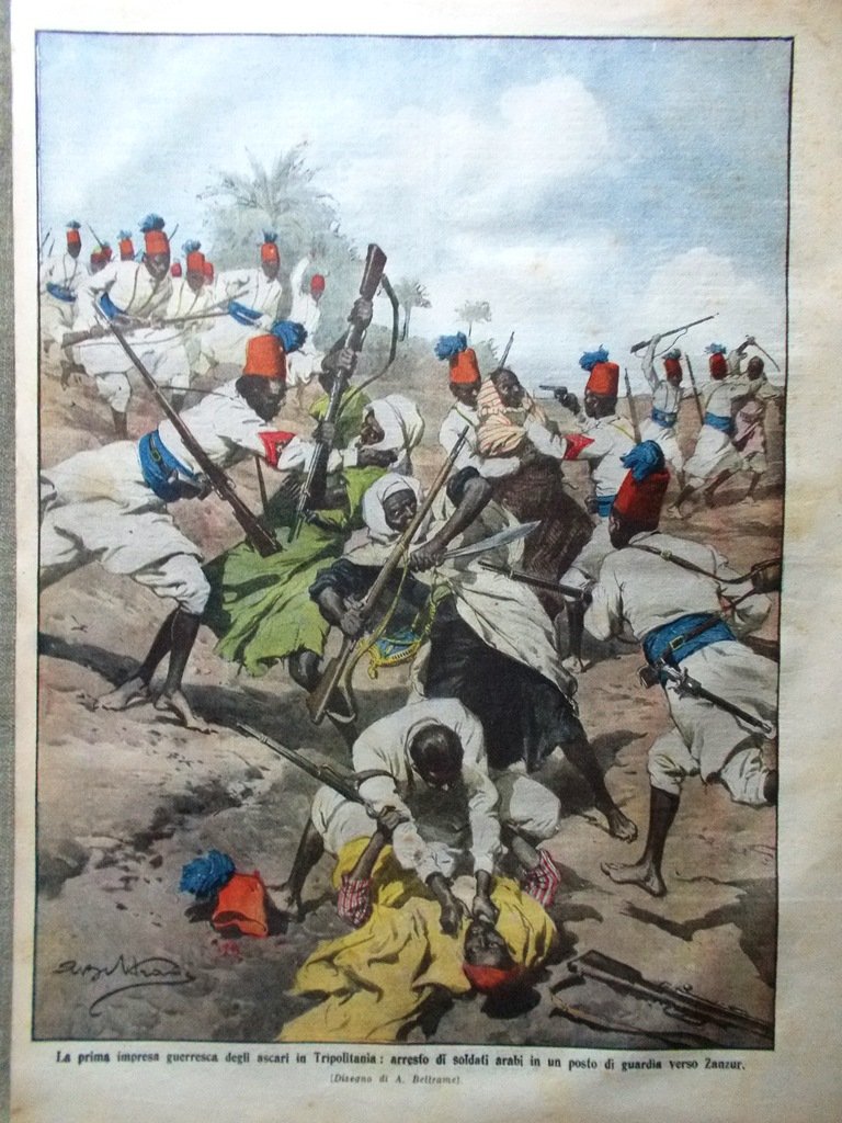 La prima impresa guerresca degli ascari in Tripolitania: arresto di soldati arabi in un posto di guardia verso Zandur (Achille Beltrame)