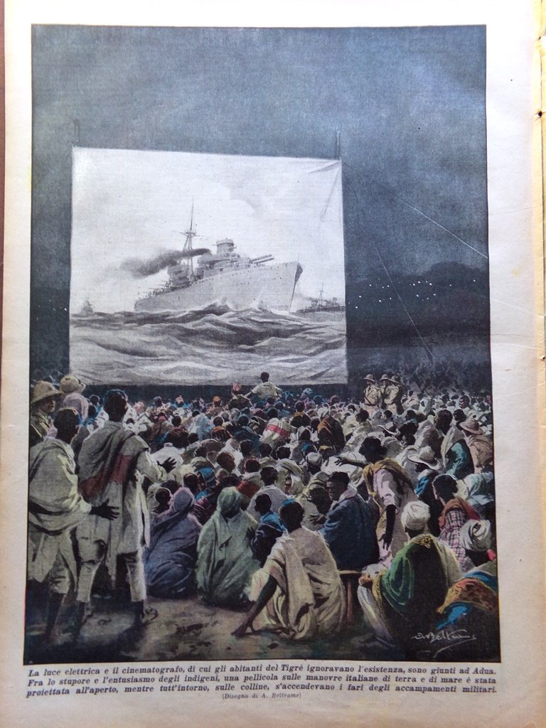 La luce elettrica e il cinematografo di cui gli abitanti del Tigrè ignoravano l'esistenza, sono giunti ad Adua. Fra lo stupore e l'entusiasmo degli indigeni, una pellicola sulle manovre italiane di terra e di mare è stata proiettata all'aperto (Achille Beltrame)