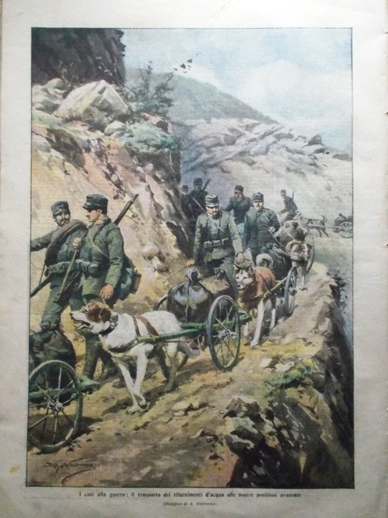 LA DOMENICA DEL CORRIERE Rivista Originale del 30 Aprile 1916 Anno 18 nr. 18 pagine: 16 dimensioni: 39 x 29 cm IN PRIMA PAGINA: Le trovate dei nostri alpini: barili e "slitte esplosive" fatte precipitare sulle posizioni austriache (Achille Beltrame) NELL'ULTIMA PAGINA: I cani alla guerra: il trasporto dei rifornimenti d'acqua alle nostre posizioni avanzate (Achille Beltrame) ALL'INTERNO: La strage degli innocenti in Inghilterra I super Zeppelin Decorati al valore Le curiosità Le fortificazioni del Veneto Premi ai valorosi Dove sono le reliquie della Passione Le vittorie russe: da Erzerum a Trebisonda Dalle retrovie al fronte: Sagrado CONDIZIONI DELLA RIVISTA: MOLTO BUONE, NORMALI SEGNI DEL TEMPO, SOVRACOPERTINE ASSENTI NOTE PARTICOLARI: MACCHIE DEL TEMPO IN ALCUNE PAGINE