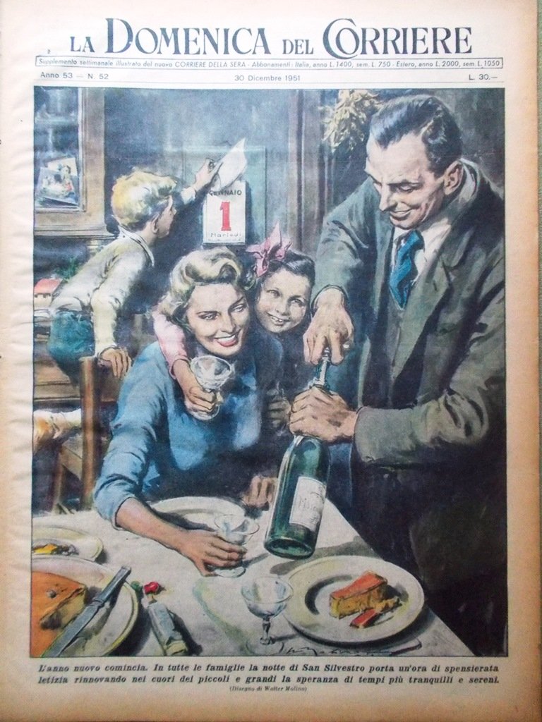 L'anno nuovo comincia. In tutte le famiglie la notte di San Silvestro porta un'ora di spensierata letizia rinnovando nei cuori dei piccoli e grandi la speranza di tempi più tranquilli e sereni (Walter Molino)