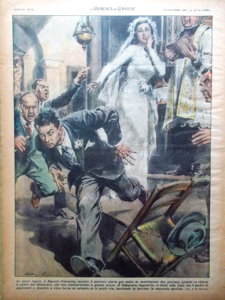 A Riposto (Catania) mentre il parroco stava per unire in matrimonio due giovani, piombò in chiesa il padre del fidanzato che era contrarissimo a queste nozze. Il fidanzato impaurito si diede alla fuga ma il padre lo agguantò e issatolo a viva forza su un'auto se lo portò via, lasciando in lacrime la mancata sposina (Walter Molino)