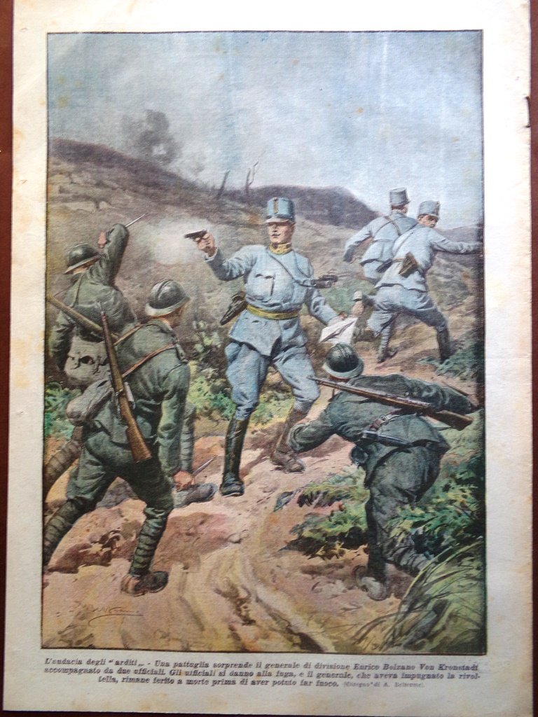 L'audacia degli "arditi". Una pattuglia sorprende il generale di divisione Enrico Bolzano Von Kronstadt accompagnato da due ufficiali. Gli ufficiali si danno alla fuga, e il generale, che aveva impugnato la rivoltella, rimane ferito a morte prima di aver potuto far fuoco (Achille Beltrame)