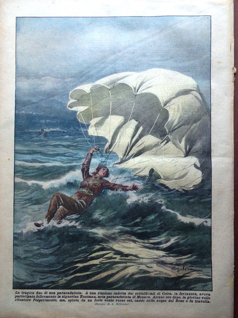 A una riunione indetta dai sottufficiali di Coira, in Svizzera, aveva partecipato felicemente la signorina Tussman, nota paracadutista di Monaco. Alcune ore dopo la giovine volle ritentare l'esperimento ma, spinta da un forte vento verso est, cadde nelle acque del Reno e fu travolta (Achille Beltrame)
