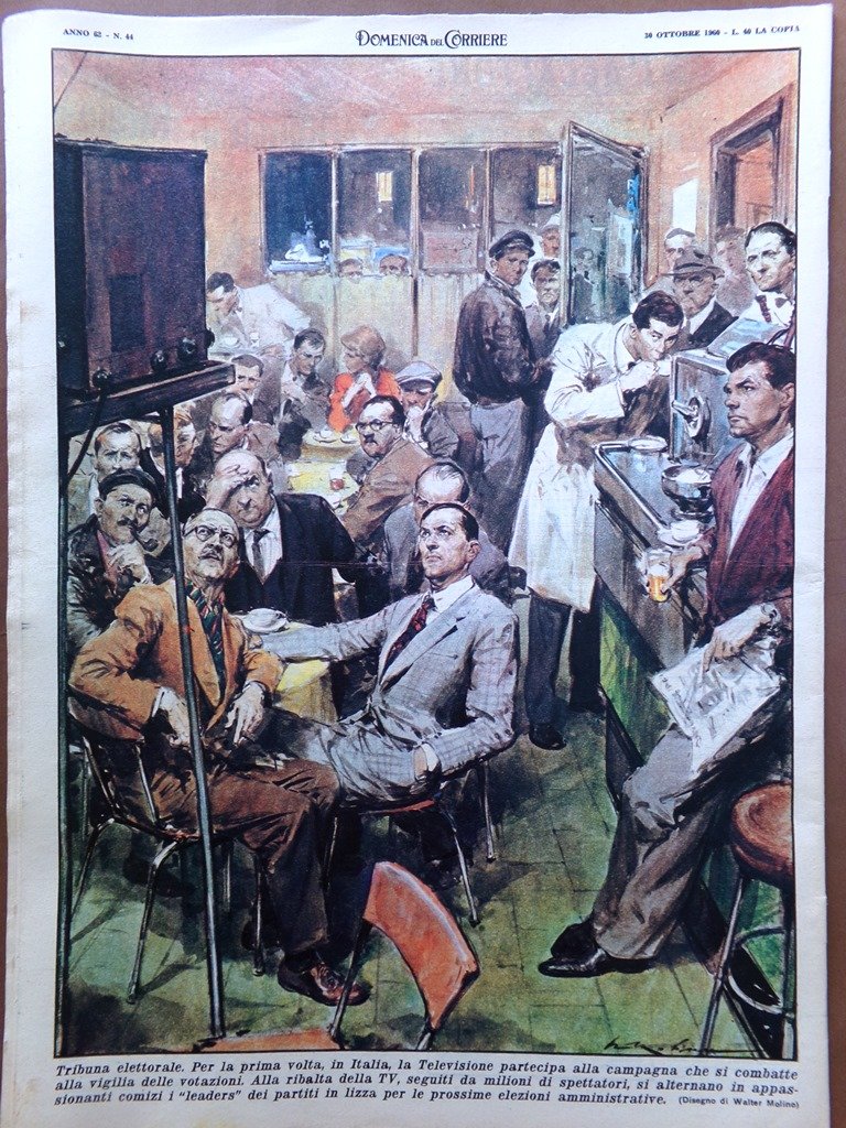 Tribuna elettorale. Per la prima volta in Italia, la televisione partecipa alla campagna che si combatte alla vigilia delle votazioni. Alla ribalta della TV, seguiti da milioni di spettatori, si alternano in appassionanti comizi i leader dei partiti in lizza per le prossime elezioni (Walter Molino)