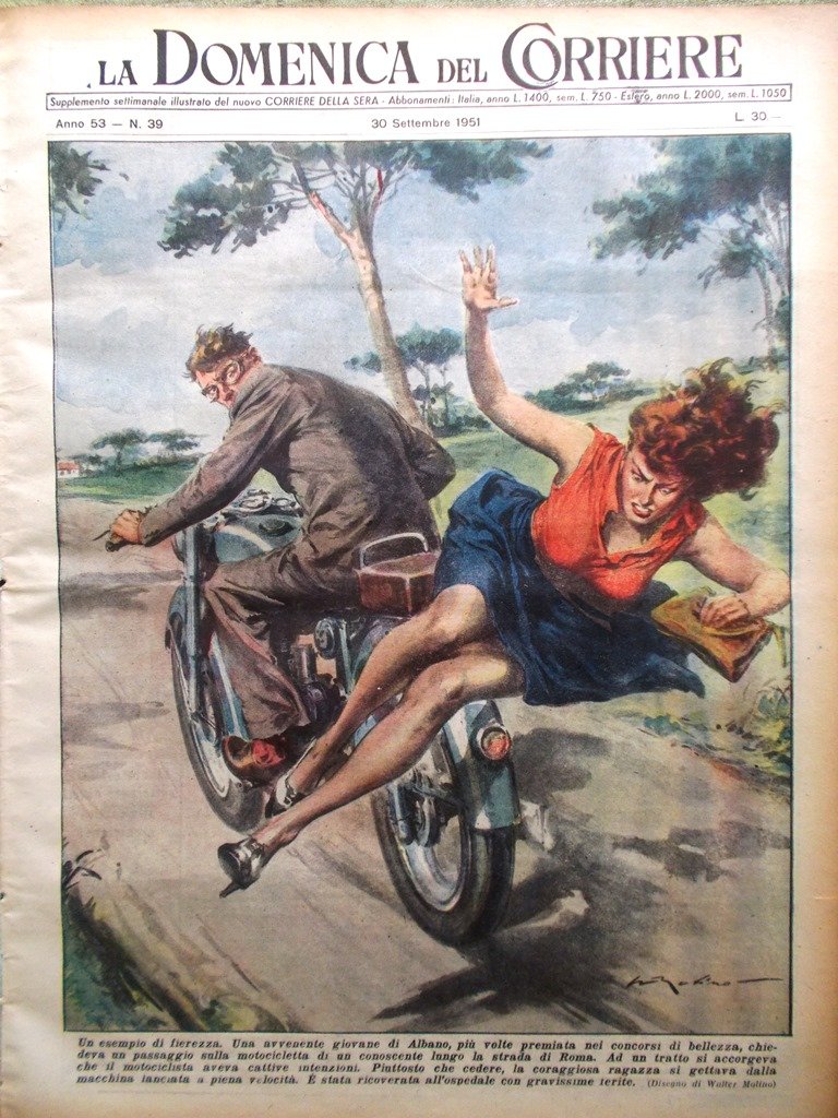 Un esempio di fierezza. Una avvenente giovane di Albano, più volte premiata nei concorsi di bellezza, chiedeva un passaggio sulla motocicletta di un conoscente lungo la strada di Roma. Ad un tratto si accorgeva che il motociclista aveva cattive intenzioni. Piuttosto che cedere, la coraggiosa ragazza si gettava dalla macchina lanciata a piena velocità. È stata ricoverata all'ospedale con gravissime ferite (Walter Molino)