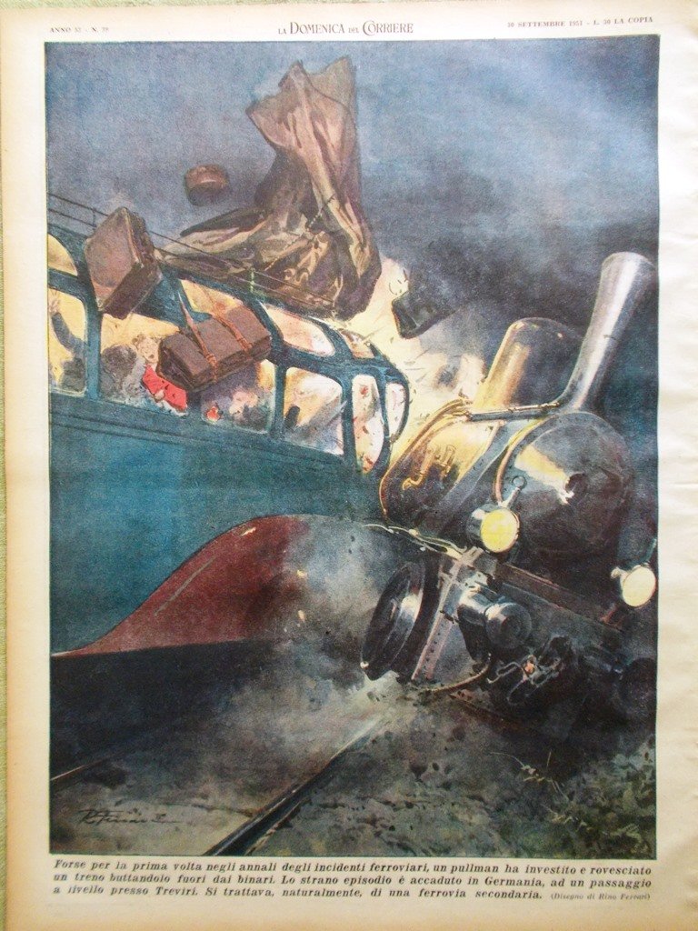 Forse per la prima volta negli annali degli incidenti ferroviari, un pullman ha investito e rovesciato un treno buttandolo fuori dai binari. Lo strano episodio è accaduto in Germania, a un passaggio a livello presso Treviri. Si trattava, naturalmente di una ferrovia secondaria (Rino Ferrari)