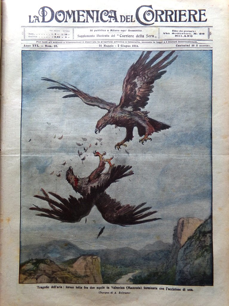 LA DOMENICA DEL CORRIERE Rivista Originale del 31 Maggio 1914 Anno 16 nr. 22 pagine: 16 (+4) dimensioni: 38 x 28 cm IN PRIMA PAGINA: Tragedie dell'aria: feroce lotta fra due aquile in Valnerina (Macerata) terminata con l'uccisione di una (Achille Beltrame) NELL'ULTIMA PAGINA: Tre alpinisti lombardi precipitano lungo l'aspra parete del torrione Magnaghi (Grigna meridionale) schiacciandosi (Achille Beltrame) ALL'INTERNO: Rocche poco note: Scandiano, Castello d'Oramala, Castello di Pietra Gravina La rinascita dell'abbazia millenaria di Nonantola, presso Modena Fidanzati di corona: Ferdinando di Spagna e Luigia Silva-Bazan Il ponte viadotto di Langwies Nuove costruzioni a Roma CONDIZIONI DELLA RIVISTA: BUONE, NORMALI SEGNI DEL TEMPO, SOVRACOPERTINE PRESENTI NOTE PARTICOLARI: LEGGERE MACCHIE DEL TEMPO E PICCOLISSIMI STRAPPETTI NEI BORDI IN ALCUNE PAGINE, PICCOLISSIMO ANGOLO MANCANTE IN BASSO A PAG 11